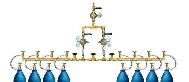 氣體匯流排指瓶裝高壓氣體,通過此設(shè)備減壓到一定的使用壓力,是集中供氣體的一種設(shè)備。匯流排由左右兩根匯流主管道組成,中間有四只高壓閥門,分別控制左右兩組匯流管,每組有相當(dāng)數(shù)量的分閥,軟管及卡具連接氣瓶,中間裝有一塊高壓表,用來檢測(cè)匯流管內(nèi)的壓力,高壓閥門上方分別有兩組減壓器,以便控制調(diào)節(jié)使用壓力及流量,減壓器上方分別有兩只低壓閥門,用來控制兩排匯流切換時(shí)的低壓氣體,匯流低壓主管道裝有一只低壓總閥門,用來控制低壓管道的氣體